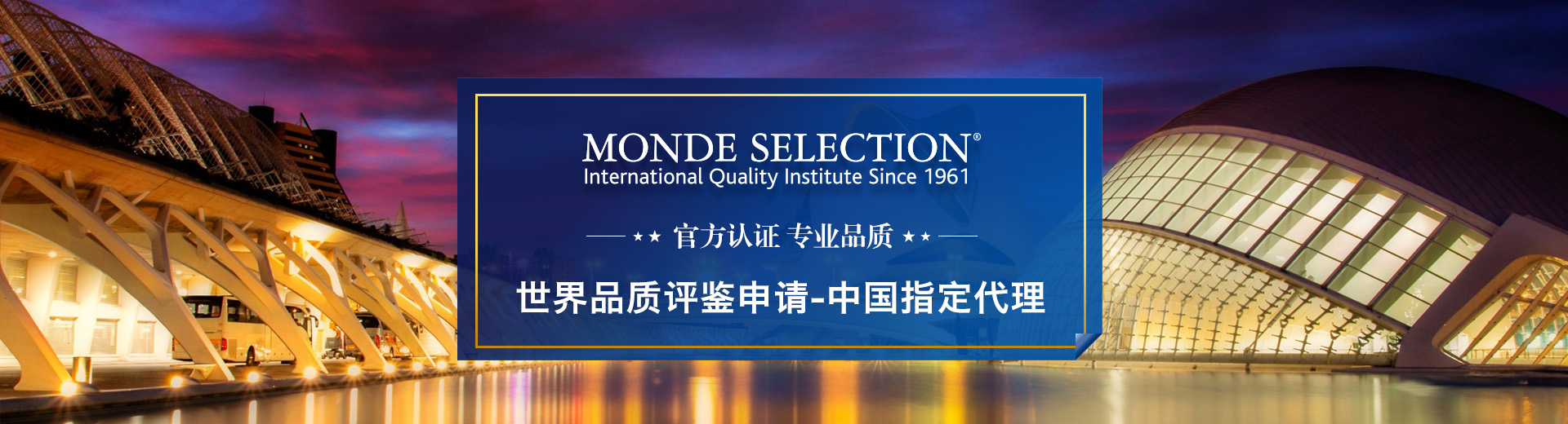 MONDE SELECTION译为“世界品质评鉴大会 ”或“国际优质食品组织” 。创建于1961年,是当今世界上历史最悠久、最权威的国际质量研究所。由欧洲共同体(EC)和比利时经贸部共同创立,总部设立在比利时的首都布鲁塞尔。世界各国每年有超过1000种商品参加品质评鉴。奖项以商品性质分类,由研究员比较各食品或产品的安全、味道、包装、原材料等各方面进行审查后评定。业内人士公认,如果获得MondeSelection世界品质嘉奖,就相当于达到国际食品评价基准的要求,意味着该食品已经获得了世界各国包括食品发达国家的认可与推崇。
